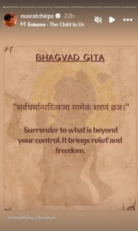 नुसरत जहां आणि यशदास गुप्ता यांच्या खासगी आयुष्याच्या चर्चा रंगलेल्या असताना नुसरतने भगवद्गीतेच्या ओळी शेअर केल्या आहेत. सोशल मीडिया इन्स्टाग्राम स्टोरी पोस्ट करत अभिनेत्री म्हणाली, ‘ज्या गोष्टी आपल्या नियंत्रणात नाहीत, त्या सोडून देणं केव्हाही चांगलं…’