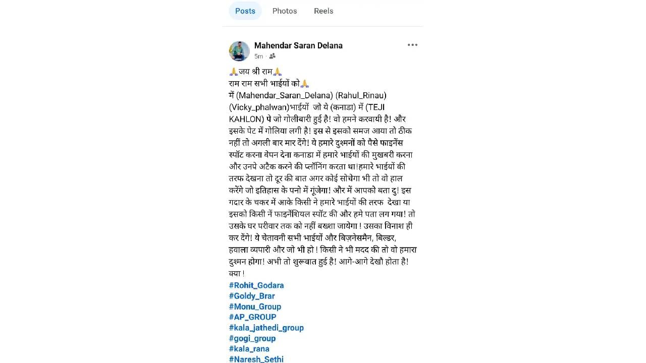 फेसबुकवर महेंद्र सरन दिलाना, राहुल रिनाऊ आणि विकी फलवान यांनी गोळीबारात तेजी जखमी झाल्याचा दावा केला आहे. ‘कॅनडामध्ये आम्ही तेजी काहलोंवर गोळीबार केला आहे. त्याच्या पोटात गोळी लागली आहे. यातून त्याला समजलं तर ठीक, अन्यथा पुढच्या वेळेस आम्ही थेट त्याला संपवू’, अशी धमकी या पोस्टद्वारे देण्यात आली आहे. या पोस्टमध्ये रोहित गोदाराच्या गँगने इतरही काही बिझनेसमन, बिल्डर्स आणि आर्थिक मध्यस्थांसह इतरांनाही शत्रू गँगला मदत करण्यापासून इशारा दिला आहे. शत्रू गँगची मदत करणाऱ्यांनाही अशीच शिक्षा भोगावी लागेल, असं त्यात लिहिलंय.