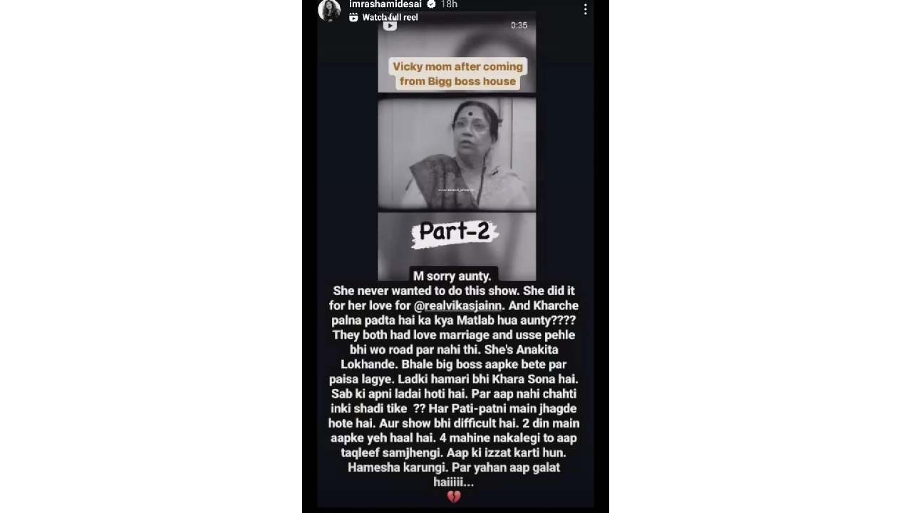 रश्मीने लिहिलं, ‘मला माफ करा आंटी. तिला कधीच हा शो करायचा नव्हता. विकास जैनच्या प्रेमापोटी तिने हा शो केला आणि खर्च उचलावे लागतात याचा काय अर्थ आहे आंटी? त्या दोघांनी प्रेमविवाह केला आणि त्याआधीही ती रस्त्यावर राहत नव्हती. ती अंकिता लोखंडे आहे. जरी बिग बॉसने तुमच्या मुलावर पैसा लावला असला तरी आमची मुलगीसुद्धा खरं सोनं आहे. सर्वांचा एक वैयक्तिक संघर्ष असतो. पण त्यांचं लग्न टिकावं अशी तुम्ही इच्छा नाही का? प्रत्येक पती-पत्नीमध्ये भांडणं होतात आणि हा शोसुद्धा कठीण आहे. दोन दिवसांत तुमची ही अवस्था आहे. चार महिने बिग बॉसच्या घरात राहिलात तर तुम्हाला तिथला त्रास समजेल. मी तुमचा आदर करते, नेहमी करेन. पण इथे तुम्ही चुकताय.’