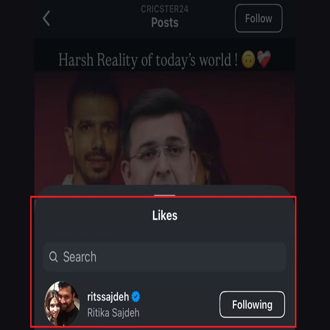Rohit Sharma wife Ritika Sajdeh: क्रिरेटर युजवेंद्र चहल याची पूर्व पत्नी आणि कोरियोग्राफर धनश्री वर्मा सध्या त्यांच्या घटस्फोटामुळे चर्चेत आहेत. गेल्या आठवड्यात दोघांचा घटस्फोट झाल्याची अधिकृत माहिती समोर आहे. पण आता पोटगीमुळे धनश्री मोठ्या संकटाचा सामना करावा लागत आहे. युजवेंद्र याला घटस्फोट दिल्यानंतर धनश्री हिने रिपोर्टनुसार 4.75 कोटी रुपयांची पोटगी घेतली आहे. ज्यामुळे धनश्रीला आता टीकेचा सामना करावा लागत आहे. एवढंच नाही तर, धनश्री वर्माच्या विरोधात सोशल मीडियावर एक पोस्ट तुफान व्हायरल होत आहे. ती पोस्ट भारतीय क्रिकेट संघाचा कर्णधार रोहित शर्माची बायको रितिका हिनेलाईक केली आहे. जामुळे आणखी चर्चा रंगल्या आहेत.