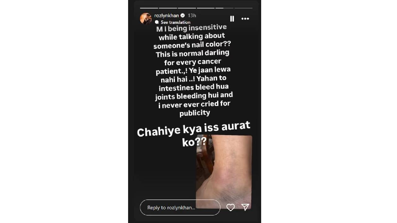 ‘एखाद्याच्या नखाच्या रंगाबद्दल बोलल्यामुळे मी असंवेदनशील ठरते का? डार्लिंग कॅन्सरच्या प्रत्येक रुग्णासाठी हे सर्वसामान्य आहे. हे प्राणघातक नाही. इथे तर आतड्यांमधून रक्तस्राव झाला, सांध्यांमधून रक्तस्राव झाला. तरी मी कधीच पब्लिसिटीसाठी रडले नाही. या बाईला अखेर हवंय तरी काय?’, असा खोचक सवाल रोझलिनने केला. रोझलिनलाही कॅन्सरचं निदान झालं होतं. मात्र उपचारानंतर तिने कॅन्सरवर मात केली. हिना तिच्या कॅन्सरबद्दल लोकांना चुकीची माहिती देतेय आणि पब्लिसिटीसाठी आजारपणाचा वापर करतेय, असा रोझलिनचा आरोप आहे.