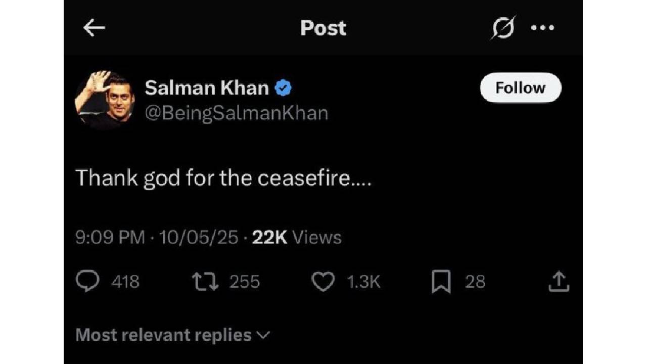 शनिवारी भारत-पाकिस्तानदरम्यान शस्त्रसंधीची घोषणा होताच सलमानने एक्स अकाऊंटवर पोस्ट लिहिली. नंतर काही तासांतच त्याने ही पोस्ट डिलिट केली. यावरून नेटकरी त्याच्यावर चांगलेच भडकले आहेत. सलमानच्या पोस्टचा स्क्रीनशॉट सोशल मीडियावर व्हायरल होत आहे.