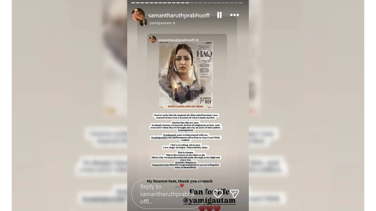 ‘हक’ हा चित्रपट आणि त्यातील यामीची दमदार कामगिरी या दोन्ही गोष्टी हृदयाला भिडणाऱ्या असल्याचं तिने म्हटलंय. समंथाने तिच्या इन्स्टा स्टोरीमध्ये याविषयीची पोस्ट लिहिली आहे. ‘हक’ची कथा खोल, संवेदनशील आणि कोणतेही पूर्वग्रह न बाळगणारी आहे. यामीने तिची भूमिका उत्कृष्टपणे साकारली आहे, असं तिने लिहिलंय. समंथाने यामीच्या अभिनयाचं वर्णन शब्दांपलीकडे आहे, असं केलं.