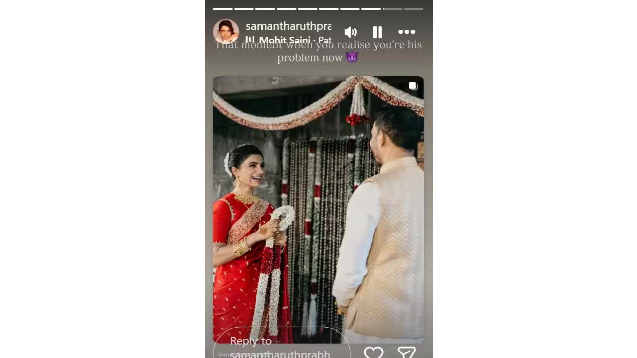 समंथाच्या लग्नाला काही तिच्या अत्यंत जवळच्या मैत्रिणीसुद्धा उपस्थित होत्या. या मैत्रिणींनीही तिच्या लग्नातील खास फोटो सोशल मीडियावर पोस्ट केले आहेत. अशाच एका मैत्रिणीची पोस्ट समंथाने तिच्या इन्स्टा स्टोरीमध्ये शेअर केली आहे. यामध्ये ती राजसमोर वरमाळा घेऊन उभी असल्याचं पहायला मिळतंय. तिच्या चेहऱ्यावरील आनंद स्पष्ट पहायला मिळतोय. हा फोटो शेअर करत समंथाने लिहिलं, ‘तो क्षण जेव्हा मला जाणवलं की आता मी त्याची प्रॉब्लेम बनली आहे.’