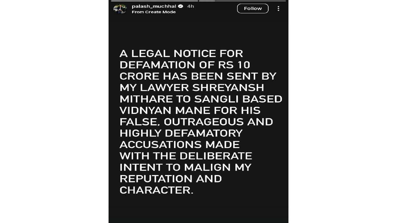 संगीतकार पलाश मुच्छल पुन्हा एकदा चर्चेत आला आहे. क्रिकेटर स्मृती मानधनाचा बालपणीचा मित्र आणि फायनान्सर विज्ञान मानेनं त्याच्यावर बरेच गंभीर आरोप केले आहेत. त्यानंतर शनिवारी रात्री पलाशने पलाशने त्याच्या इन्स्टाग्राम स्टोरीमध्ये एक पोस्ट लिहित विज्ञानविरोधात मानहानीचा दावा करणार असल्याचा इशारा दिला. पलाशने लिहिलं, ‘माझे वकील श्रेयांश मिठारे यांनी सांगलीचे रहिवासी विज्ञान माने यांना 10 कोटी रुपयांची मानहानीची कायदेशीर नोटीस पाठवली आहे. त्यांनी माझं चारित्र्य जाणूनबुजून कलंकित करण्याच्या उद्देशाने खोटे, अश्लील आणि बदनामीकारक आरोप केले आहेत.’ आता पलाशच्या नोटिशीला विज्ञान मानेनंही उत्तर दिलं आहे.