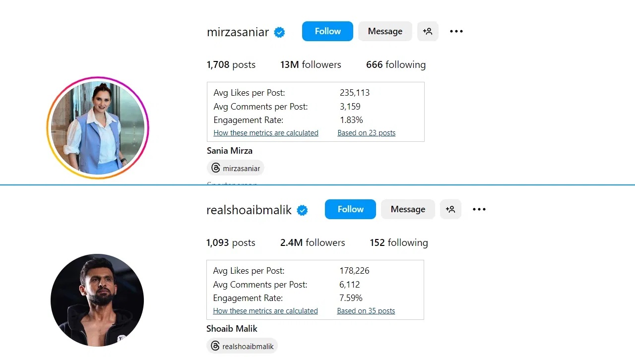 पण आता सानिया मिर्झा आणि शोएब मलिक यांच्यामध्ये कोणाच्या चाहत्यांची संख्या फार मोठी आहे. याशिवाय सोशल मीडियावर कोणाचा बोलबाला अधिक आहे? यावर चर्चा रंगली आहे. या शर्यतीत शोएब मलिक मागे राहिला आहे. सानिया हिने तिच्या सौंदर्याने आणि दमदार खेळामुळे चाहत्यांच्या मनावर राज्या केलं आहे. सानिया हिची प्रत्येक स्टाईल चाहत्यांना आवडते. तर जाणून इन्स्टाग्रामवर शोएब मलिक आणि सानिया मिर्झा यांचे किती फॉलोअर्स आहेत.