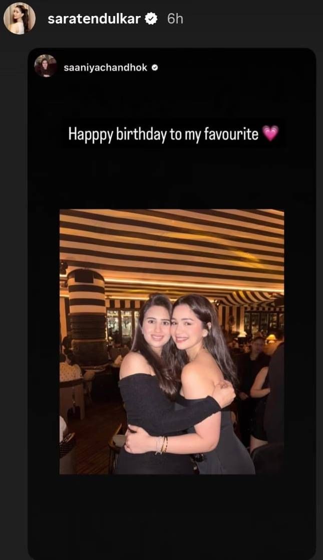 साराला अर्जुन तेंडुलकर आणि वडील सचिन तेंडुलकर यांनी देखील सोशल मीडियाच्या माध्यमातून शुभेच्छा दिल्या. अर्जुन तेंडुलकरने काही दिवसांपूर्वीच साखरपुडा केला आहे. सानिया ही अर्जुनची लहानपणीची मैत्रिण आहे. सारा आणि सानिया या दोघींमध्येही चांगले नाते आहे. त्यांचा एक व्हिडीओ देखील व्हायरल झाला होता. दोघीही व्हिडीओमध्ये मजामस्ती करताना दिसत होत्या. त्यामुळे सानिया आणि साराची यांची चांगली मैत्री असल्याचे स्पष्ट दिसत आहे.