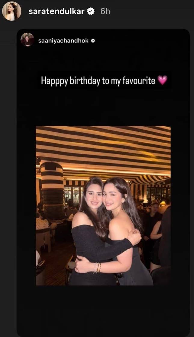 अर्जुन तेंडूलकरची होणारी बायको सानिया चंडोकने तिच्या अधिकृत इन्स्टाग्राम अकाऊंटच्या माध्यमातून साराला वाढदिवसाच्या शुभेच्छा दिल्या आहे. तिने सारासोबतचा एक फोटो शेअर केला आहे. यावर तिने ‘माझ्या सर्वात आवडत्या व्यक्तीला वाढदिवसाच्या शुभेच्छा’ असे कॅप्शन दिले आहे. सानियाची ही पोस्टपाहून अर्जुन देखील खूश झाला असल्याचे म्हटले जात आहे. सध्या सोशल मीडियावर या पोस्टची चर्चा सुरु आहे.