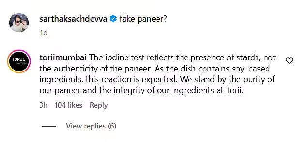 सार्थकच्या व्हिडीओवर स्पष्टीकरण देत ‘टोरी’ हॉटेलचे कर्मचारी म्हणाले, ‘आयोडीन परीक्ष स्टार्चच्या उपस्थितीला दर्शवतो. ज्यामुळे ही प्रतिक्रिया अपेक्षित आहे. आम्ही आमच्याकडील पनीरची शुद्धता आणि टोरीमधील सामग्रीच्या बाजूने आहोत…’ यावर सार्थक म्हणाला, ‘तर आता मला बॅन केलं आहे का? पण तुमच्याकडे मिळणारे पदार्थ चविष्ट आहेत…’ व्हिडीओवर नेटकरी देखील कमेंट करत प्रतिक्रिया देत आहेत.