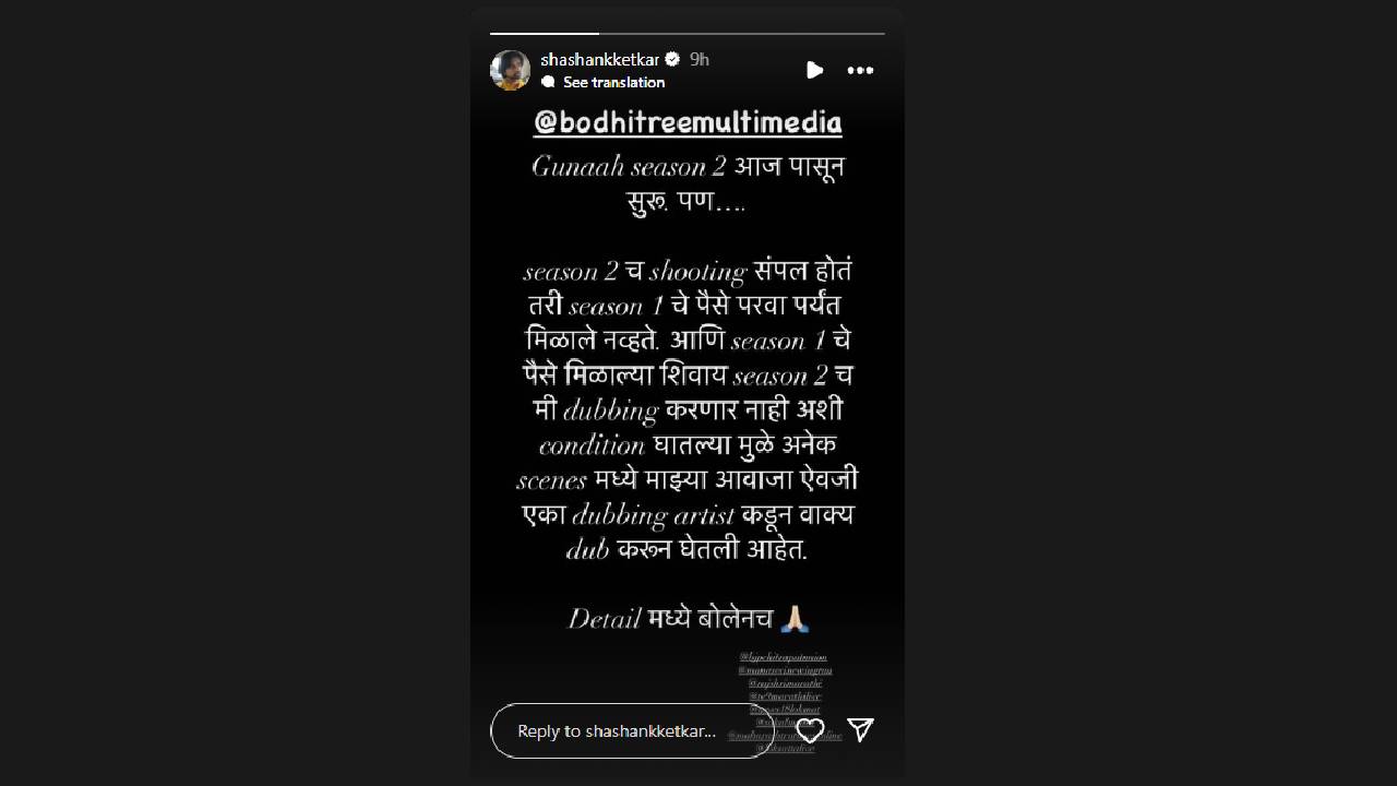 ‘गुनाह या वेब सीरिजचा दुसरा सिझन आजपासून सुरू झाला आहे. पण.. सिझन 2 चं शूटिंग संपलं होतं तरी पहिल्या सिझनचे पैसे परवापर्यंत मिळाले नव्हते आणि सिझन 1 चे पैसे मिळाल्याशिवाय सिझन 2 चं मी डबिंग करणार नाही अशी अट घातल्यामुळे अनेक सीन्समध्ये माझ्या आवाजाऐवजी एका डबिंग आर्टिस्टकडून वाक्य डब करून घेतली आहेत. याबद्दल मी सविस्तर बोलेनच..’, अशी पोस्ट शशांकने लिहिली आहे.