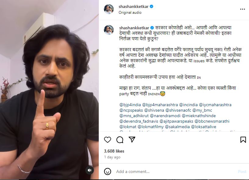 हा व्हिडीओ शेअर करताना शशाकने कॅप्शनमध्ये असं लिहिले आहे की, “सरकार कोणतेही असो… आपली आणि आपल्या देशाची अवस्था कधी सुधारणार? ही जबाबदारी नेमकी कोणाची? इतका निर्लज्जपणा येतो कुठून? सरकार बदललं की सगळं बदलेल वगैरे फालतू पर्याय सुचवू नका. गेली अनेक वर्ष आपला देश अस्वच्छ देशांच्या यादीत अग्रेसरच आहे. त्यामुळे या आधीच्या अनेक सरकारांनीसुद्धा काही आपल्याकडे, या प्रश्नाकडे, सपशेल दुर्लक्षच केलं आहे. काहीतरी कायमस्वरूपी उपाय हवा आहे देशाला माझा हा राग, संताप… हा या अवस्थेबद्दल आहे… कोणा एका व्यक्ती किंवा पक्षाबद्दल नाही”.