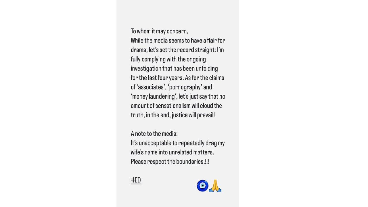 ‘ज्यांच्याशी या गोष्टीचा संबंध असेल त्यांना मी स्पष्ट करू इच्छितो.. मीडियाला नाटकाची आवड तर आहेच, पण काही तथ्य समोर आणणं गरजेचं आहे. गेल्या चार वर्षांपासून सुरू असलेल्या तपासाला मी पूर्णपणे सहकार्य करतोय. सहकारी, पॉर्नोग्राफी आणि मनी लाँड्रींगचा दावा करणाऱ्यांना मी सांगू इच्छितो की याबद्दल कितीही सनसनाटी केली जात असली तरी सत्य ढगाआड लपणार नाही. अखेर न्यायाचा विजय होईल’, असं त्याने या पोस्टमध्ये म्हटलंय. यापुढे त्याने मीडियासाठी एक टीपसुद्धा लिहिली आहे. ‘माझ्या पत्नीचं नाव तिच्याशी संबंधित नसलेल्या प्रकरणांमध्ये वारंवार ओढणं मला अस्वीकार्य आहे. कृपया मर्यादांचा आदर करा’, अशी टीप त्याने लिहिली आहे. या पोस्टच्या अखेरीस त्याने ‘ईडी’ असा हॅशटॅग दिला आहे.