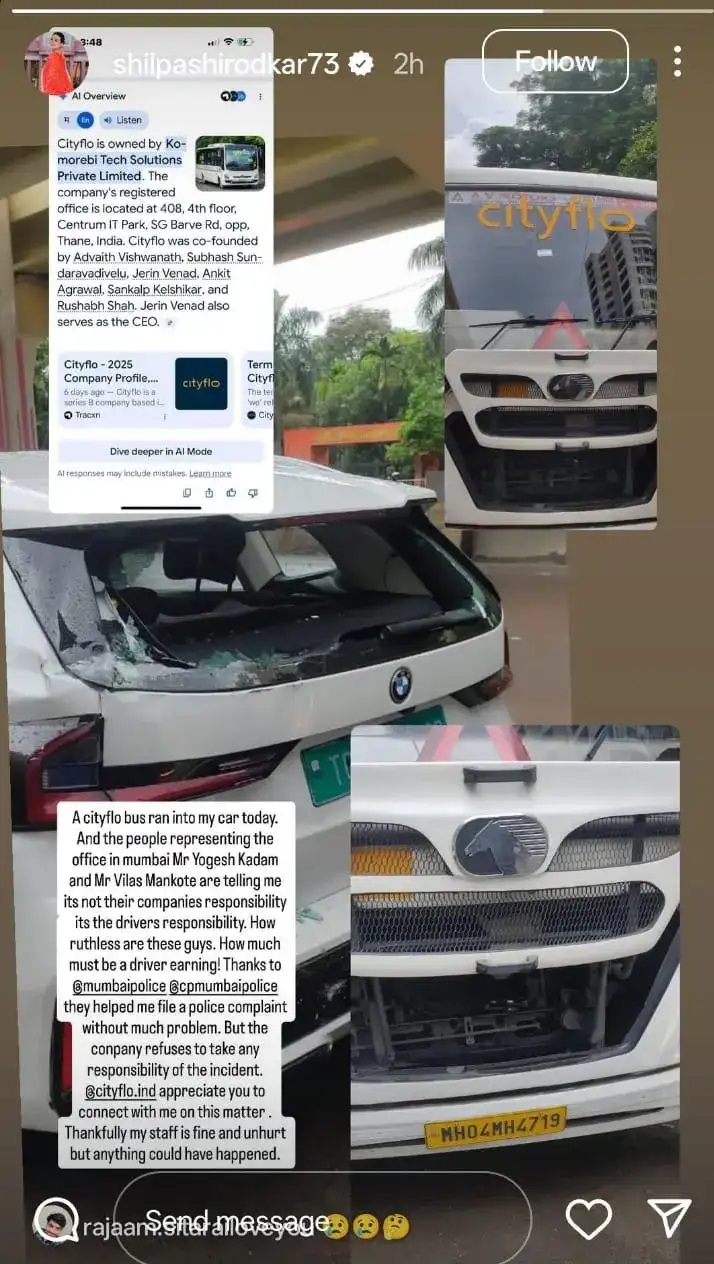 पुढे अभिनेत्री म्हणाली, ‘@mumbaipolice @cpmumbaipolice यांचे आभार. यांनी कोणत्याही अडचणी शिवाय पोलिसांत तक्रार दाखल करण्यात माझी मदत केली. पण कंपनी घटने कोणतीच जबाबदारी घेण्यास तयार नाही. @cityflo.ind या प्रकरणावर माझ्यासोबत आल्याबद्दल धन्यवाद. सुदैवाने माझे कर्मचारी ठीक आहे आणि त्यांना काहीही दुखापत झाली नाही, पण काहीही घडू शकलं असतं.’ असं शिल्पा म्हणाली. सध्या अभिनेत्रीची पोस्ट सोशल मीडियावर तुफान व्हायरल होत आहे.