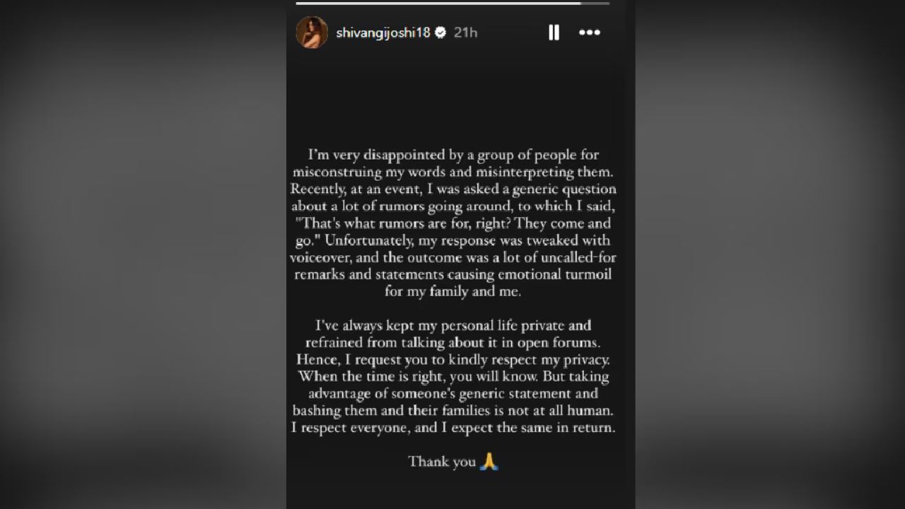 ‘ये रिश्ता क्या कहलाता है’ या मालिकेत नायराची भूमिका साकारून घराघरात पोहोचलेली अभिनेत्री शिवांगी जोशी सध्या ‘बरसातें’ या मालिकेमुळे तुफान चर्चेत आहे. या मालिकेत ती अभिनेता कुशल टंडनसोबत काम करतेय. या दोघांची ऑनस्क्रीन केमिस्ट्री तर हिट ठरतेय. पण त्याचसोबत खऱ्या आयुष्यातही शिवांगी आणि कुशल एकमेकांना डेट करत असल्याच्या चर्चांना उधाण आलं आहे. इतकंच नव्हे तर हे दोघं लवकरच साखरपुडा करणार असल्याचंही म्हटलं जात आहे. या चर्चांवर अखेर शिवांगीने मौन सोडलं आहे. तिने सोशल मीडियावर भलीमोठी पोस्ट लिहित नाराजी व्यक्त केली आहे.