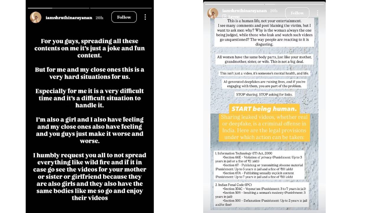 आणखी एका पोस्टमध्ये श्रुती नारायण तिला ट्रोल करणाऱ्यांवर भडकली आहे. त्यात तिने लिहिलं, ‘हे एका व्यक्तीचं आयुष्य आहे तुमच्यासाठी मनोरंजन नाही. मी अनेक कमेंट्स आणि पोस्ट पाहतेय, ज्यामध्ये पीडितेवर आरोप केला जातोय पण मी पुरुषांना विचारू इच्छिते की का? प्रत्येक वेळी महिलेवरच का प्रश्न उपस्थित केले जातात? जे लोक हे व्हिडीओ लीक करत आहेत आणि पाहत आहेत त्यांना का सवाल केला जात नाही? यावर लोक ज्या पद्धतीने प्रतिक्रिया देत आहेत, ते घृणास्पद आहे. प्रत्येक महिलेचं शरीर एकसारखंच असतं, तुमच्या आईसारखं, आजीसारखं, बहिणीसारखं किंवा पत्नीसारखं. ही काही मोठी गोष्ट नाही. हा फक्त व्हिडीओ नाही, हे एखाद्याचं मानसिक स्वास्थ्य आणि आयुष्य आहे. एआय जनरेटेड आणि डीप-फेक व्हिडीओ हे लोकांचं आयुष्य उद्ध्वस्त करत आहेत. तुम्ही अशा व्हिडीओंना समर्थन देत असाल तर तुम्हीसुद्धा समस्येचा भाग आहात. शेअर करणं थांबवा. लिंक मागणं थांबवा.’