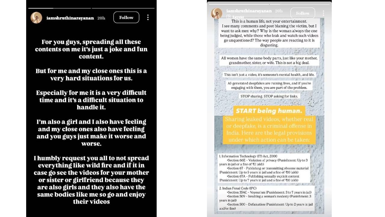 आणखी एका पोस्टमध्ये श्रुती नारायण तिला ट्रोल करणाऱ्यांवर भडकली आहे. त्यात तिने लिहिलं, ‘हे एका व्यक्तीचं आयुष्य आहे तुमच्यासाठी मनोरंजन नाही. मी अनेक कमेंट्स आणि पोस्ट पाहतेय, ज्यामध्ये पीडितेवर आरोप केला जातोय पण मी पुरुषांना विचारू इच्छिते की का? प्रत्येक वेळी महिलेवरच का प्रश्न उपस्थित केले जातात? जे लोक हे व्हिडीओ लीक करत आहेत आणि पाहत आहेत त्यांना का सवाल केला जात नाही? यावर लोक ज्या पद्धतीने प्रतिक्रिया देत आहेत, ते घृणास्पद आहे. प्रत्येक महिलेचं शरीर एकसारखंच असतं, तुमच्या आईसारखं, आजीसारखं, बहिणीसारखं किंवा पत्नीसारखं. ही काही मोठी गोष्ट नाही. हा फक्त व्हिडीओ नाही, हे एखाद्याचं मानसिक स्वास्थ्य आणि आयुष्य आहे. एआय जनरेटेड आणि डीप-फेक व्हिडीओ हे लोकांचं आयुष्य उद्ध्वस्त करत आहेत. तुम्ही अशा व्हिडीओंना समर्थन देत असाल तर तुम्हीसुद्धा समस्येचा भाग आहात. शेअर करणं थांबवा. लिंक मागणं थांबवा.’