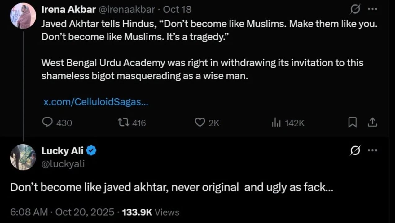 लकी अली यांनी सोशल मीडियावर जावेद अख्तर यांच्या विरोधात झोंबरी टीका केली आहे. जावेद अख्तर यांच्या व्हिडीओतील वक्तव्या संदर्भात एका महिला युजरने जावेद यांच्यावर जोरदार टीका केली होती. त्या महिला युजरला उत्तर देताना लकी अली यांनी लिहीले की, ‘जावेद अख्तर सारखे बनू नका…कधी ओरिजनल राहिले नाहीत आणि खूपच घटिया आहेत..’