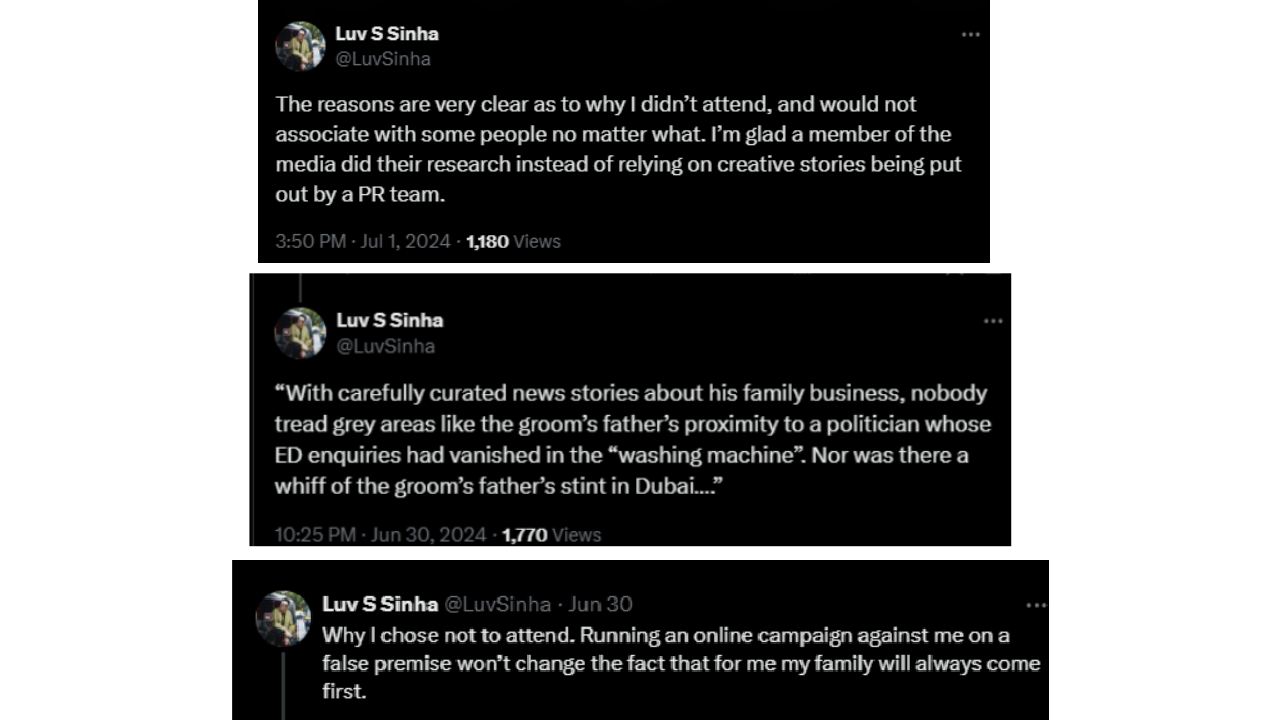 ‘त्याच्या कौटुंबिक व्यवसायाबद्दल काळजीपूर्वक बातम्या तयार केल्या गेल्या आहेत. मुलाच्या वडिलांचं एका अशा राजकारण्याशी जवळचे संबंध आहेत, ज्याची ईडी चौकशी वॉशिंग मशीनमध्ये गायब झाली होती, याकडे कोणी लक्ष वेधत नाही. तसंच मुलाच्या वडिलांच्या दुबईतील वास्तव्याबद्दलही कोणतीच चर्चा नाही’, असं वादग्रस्त ट्विट लव सिन्हाने केलं होतं. यापुढे त्याने म्हटलं होतं, ‘मी लग्नाला उपस्थित का राहिलो नाही याची कारणं अगदी स्पष्ट आहेत आणि काहीही झालं तरी मी काही लोकांशी कधीच संबंध ठेवणार नाही. मला आनंद आहे की मीडियाच्या सदस्याने पीआर टीमद्वारे मांडलेल्या सर्जनशील कथांवर अवलंबून न राहता त्यांचा रिसर्च केला.’