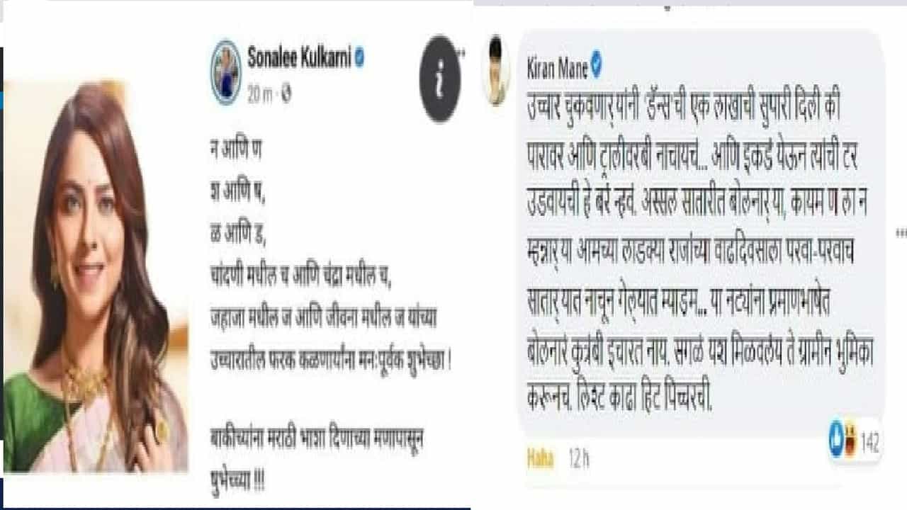 मुंबईः महाराष्ट्रात मराठी भाषा दिन असला की, अगदी सेलिब्रेटीपासून ते जनमाणसातील सगळ्यांना भाषेचं प्रचंड उधाण येते, त्यातही मराठी सेलिब्रेटी (Marathi celebrities) असले की ते उधाण अधिकच असते. यावर्षीच्या मराठी भाषा गौरव दिनाला अभिनेत्री सोनाली कुलकर्णी (Sonali Kulkarni) वेगळ्या स्टाईलमध्ये मराठी गौरव दिनाच्या शुभेच्छा द्यायला गेली आणि ट्रोल झाली. एवढ्यावरच हे प्रकरण थांबले नाही, तिच्या या शुभेच्छांना मराठी कलाकारांनी आणि यूजर्संनी ज्या पद्धतीने तिला उत्तर द्यायची होती ती दिलीच पण या सगळ्यात मराठी भाषेत आणि अस्सल गावरान म्हणजेच प्रादेशिक बोलीत ज्यांनी प्रतिक्रिया कमेंट दिली त्या अभिनेता किरण माने (Kiran Mane) यांची कमेंटच जास्त ट्रोल झाली आणि सोनाली कुलकर्णीला आपली पोस्ट डिलीट करावी लागली.