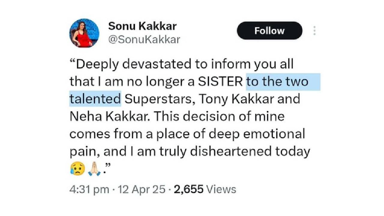कक्कर कुटुंबातील तिघेही म्युझिक इंडस्ट्रीमध्ये प्रसिद्ध आहेत. सोनू अनेक गायनाच्या रिअॅलिटी शोजमध्ये परीक्षक म्हणून उपस्थित राहिली आहे. त्याचसोबत तिने कोक स्टुडिओ इंडियासोबतही काम केलंय. नेहा आणि टोनी या दोघांसोबत तिने अनेक गाणी गायली आहेत. टोनीने संगीतबद्ध केलेल्या अनेक गाण्यांना सोनूने आवाज दिला आहे. इतकंच नव्हे तर या तिघांनी अनेकदा विविध मंचांवर एकत्र परफॉर्मसुद्धा केलं आहे. भावनिक वेदनेतून सोनूने हा निर्णय घेतल्याचं समजत असलं तरी त्यामागचं नेमकं कारण अद्याप समोर आलं नाही. तिच्या या पोस्टवर अद्याप नेहा कक्कर किंवा टोनी कक्करने कोणतीच प्रतिक्रिया दिली नाही.