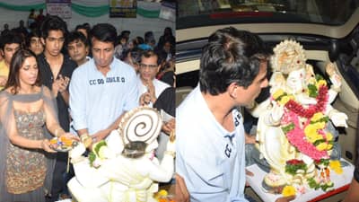 यावेळी सोनू सूद त्याची पत्नी सोनाली सूद आणि मुलगा इशांत सूदसोबत दिसला. सोनालीने विसर्जनाच्या आधी बाप्पाची आरती केली.