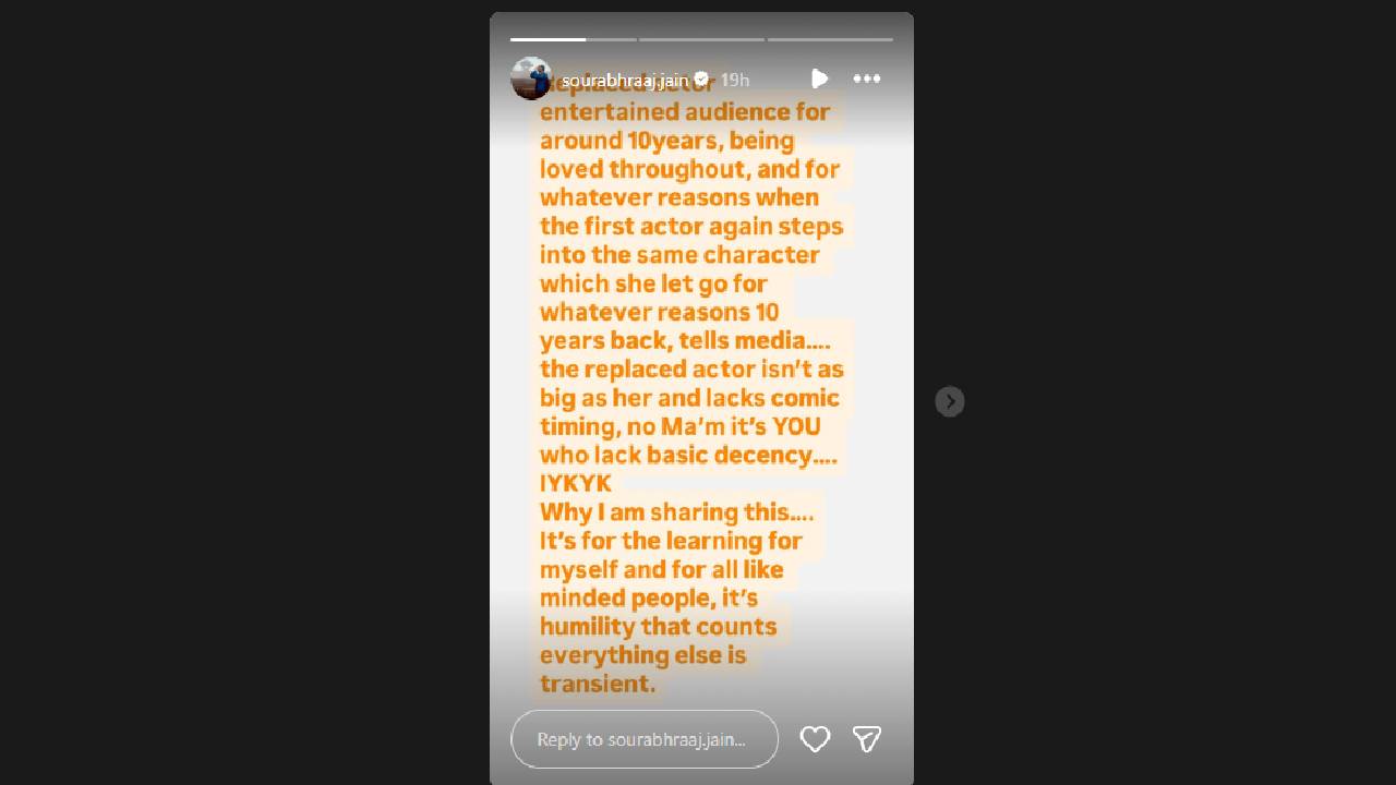 ‘मालिकेत रिप्लेस (बदललेल्या) केलेल्या अभिनेत्रीने जवळपास 10 वर्षांपर्यंत प्रेक्षकांचं मनोरंजन केलं आणि या संपूर्ण प्रवासात प्रेक्षकांनीही तिच्यावर प्रेमाचा वर्षाव केला. आता कोणत्याही कारणास्तव जेव्हा पहिली अभिनेत्री पुन्हा त्याच भूमिकेत परततेय, जी भूमिका तिने दहा वर्षांपूर्वी कोणत्यातरी कारणांसाठी सोडली होती, ती मीडियाला सांगतेय की बदललेली अभिनेत्री तिच्याइतकी मोठी नाही आणि तिच्यात विनोदाच्या टायमिंगची कमतरता आहे’, असं त्याने लिहिलंय.