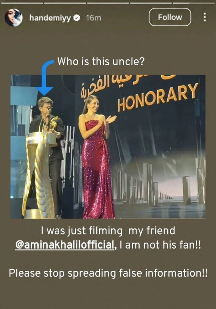 मात्र त्यानंतर Hande हिने थेट तिच्या इन्स्टाग्राम अकाऊंवरून स्टोरी शेअर केली , त्यात शाहरुख आणि अमीना यांचा ऑनस्टेज फोटो होता. त्यात तिने किंग खान, शाहरुखचं नाव घेतलं आणि लिहीलं -कौन है ये अंकल? ( हे काका कोण आहेत ?) शाहरुखला काका म्हणत तिने हा सवाल विचारला.