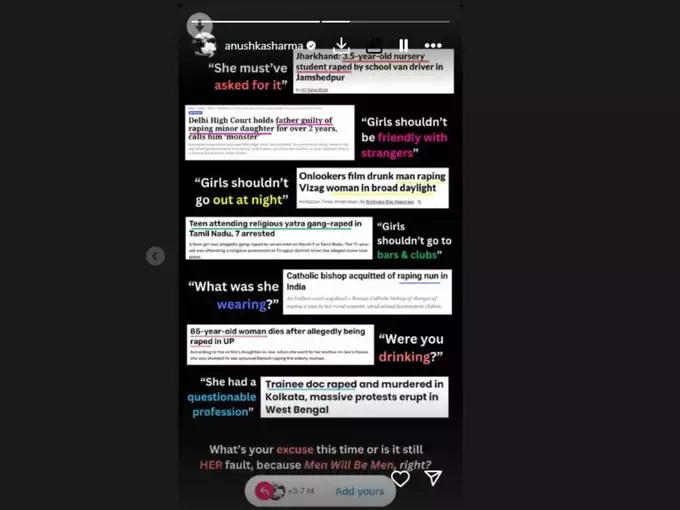 अनुष्का शर्मा हिने शेअर केलेल्या यादीमध्ये फक्त कोलकाता याठिकाणी डॉक्टरवर झालेल्या बलात्कार आणि हत्येबद्दलच नाही तर, अनेक धक्कादायक घटना दिसत आहेत. पीडित महिलांमध्ये 2 वर्षांच्या मुलीपासून 85 वर्षांची महिला देखील आहे. सांगायचं झालं तर, पोस्ट आतापर्यंत सोशल मीडियावर प्लॅटफॉर्मवर 3.7 मिलियन वेळा शेअर करण्यात आली आहे. तर पोस्टच्या शेवटी ‘आजही तिची चुक आहे का ?’ असा प्रश्न विचारण्यात आला.