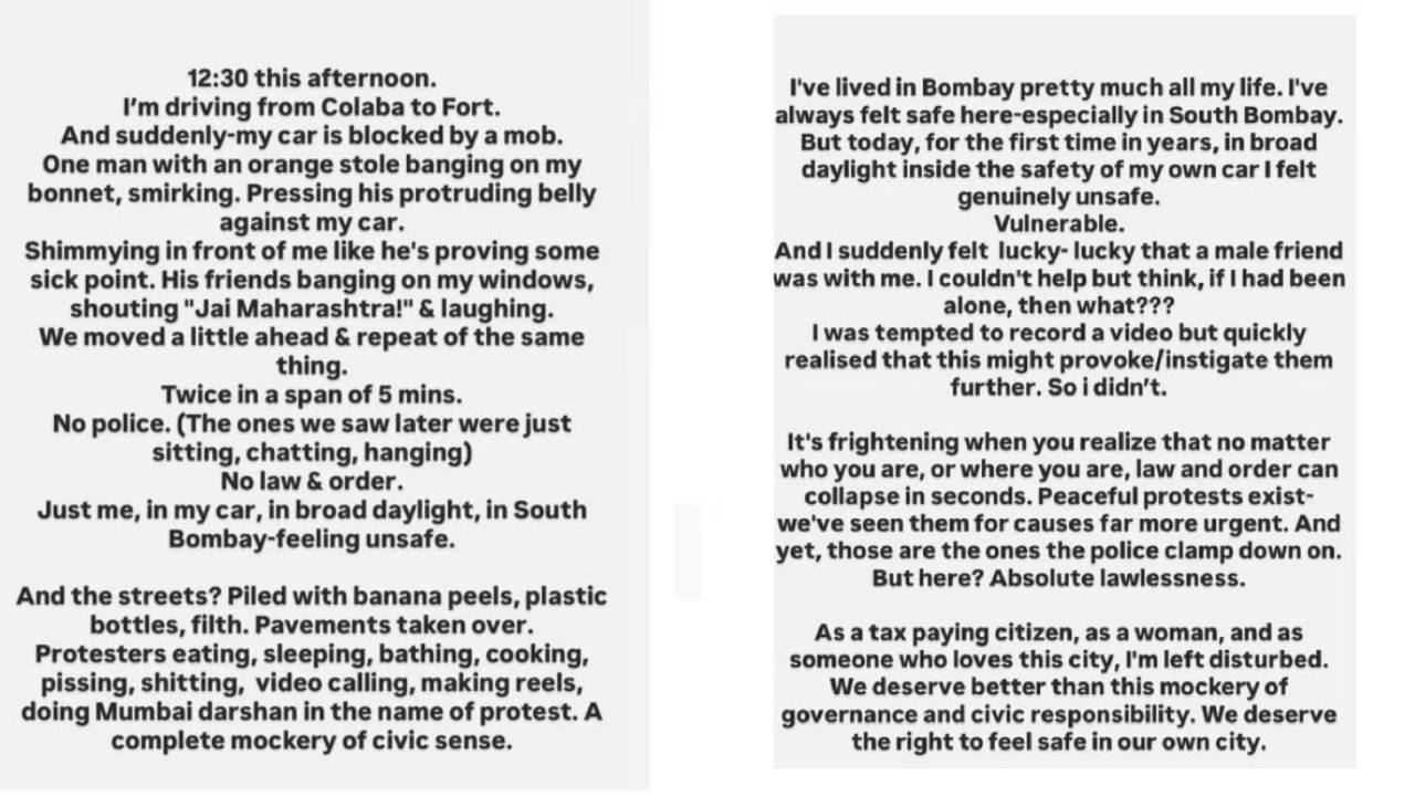 ‘आज दुपारी 12.30 वाजता.. मी कुलाबाहून फोर्टला कारने जात होते आणि अचानक एका गर्दीने माझी गाडी अडवली. गळ्यात भगवा पंचा घातलेली एक व्यक्ती माझ्या गाडीच्या बोनेटवर जोरजोरात हात मारत होती आणि मिश्कीलपणे हसत होती. त्याचे इतर साथीदार माझ्या गाडीच्या काचेजवळ आले आणि जय महाराष्ट्रच्या घोषणा देत जोरजोरात हसत होते. आम्ही थोडं पुढे गेलो आणि पुन्हा तेच घडलं. पाच मिनिटांच्या अंतराने दोनदा ही घटना घडली. पोलीस नव्हते (आम्ही ज्यांना पाहिलं ते फक्त बसून गप्पा मारत होते.) कायदा आणि सुव्यवस्था नव्हती. दक्षिण मुंबईत भरदिवसा मला माझ्या कारमध्येही असुरक्षित वाटत होतं’ असं तिने लिहिलं.