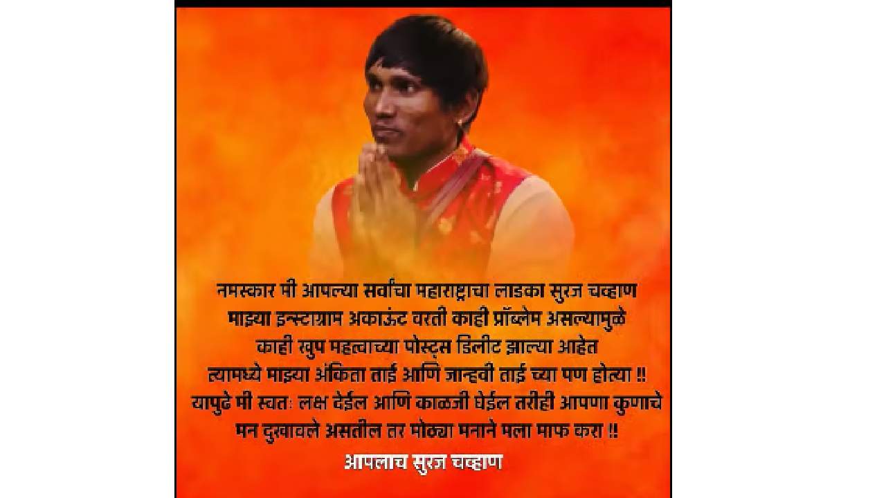 ‘नमस्कार मी आपल्या सर्वांचा महाराष्ट्राचा लाडका सूरज चव्हाण.. माझ्या इन्स्टाग्राम अकाऊंटवर काही प्रॉब्लेम असल्यामुळे काही खूप महत्त्वाच्या पोस्ट डिलीट झाल्या आहेत. त्यामध्ये माझ्या अंकिता ताई आणि जान्हवी ताईच्या पण होत्या. यापुढे मी स्वत: लक्ष देईन आणि काळजी घेईन. तरीही आपणा कुणाचे मन दुखावले असतील तर मोठ्या मनाने मला माफ करा,’ अशी पोस्ट त्याने लिहिली आहे.