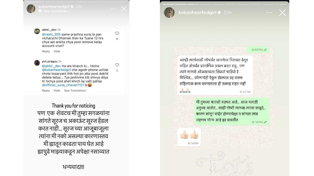 सूरजने फोटो डिलिट केल्याची गोष्ट नेटकऱ्यांनी अंकिताच्या निदर्शनास आणून दिली. त्यानंतर तिनेही त्यावर प्रतिक्रिया दिली. ‘निदर्शनास आणून दिल्याबद्दल धन्यवाद. पण एक शेवटचं मी तुम्हा सगळ्यांना सांगते की सूरजचं अकाऊंट सूरज हँडल करत नाही. सूरजच्या आजूबाजूच्या लोकांना मी नको असल्या कारणास्तव मी यातून काढता पाय घेत आहे. यापुढे माझ्याकडून अपेक्षा नसाव्यात’, असं ती एका पोस्टमध्ये म्हणाली. तर अंकिताने एका युजरला दिलेल्या उत्तराचाही स्क्रीनशॉट शेअर केला आहे. त्यात ती म्हणतेय, ‘आज मलाही अनुभव आलेत. काही गोष्टी त्याच्या त्याला कळू दे. कारण सांगून वाईट होण्यापेक्षा न सांगता लांब राहणंच योग्य आहे या बाबतीत.’