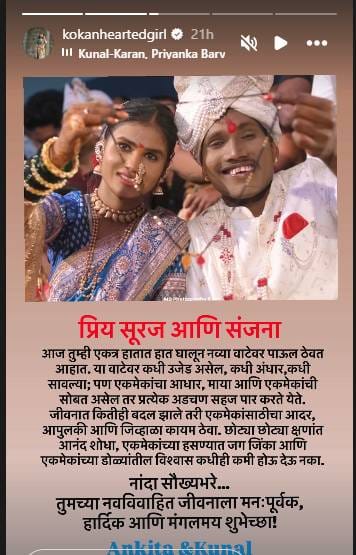 दरम्यान असं असलं तरी आता अंकिताने नवविवाहीत जोडपं सुरज आणि संजना या दोघांसाठी सोशल मीडियावर एक खास पोस्ट लिहीत त्यांना शुभेच्छा दिल्या आहेत.