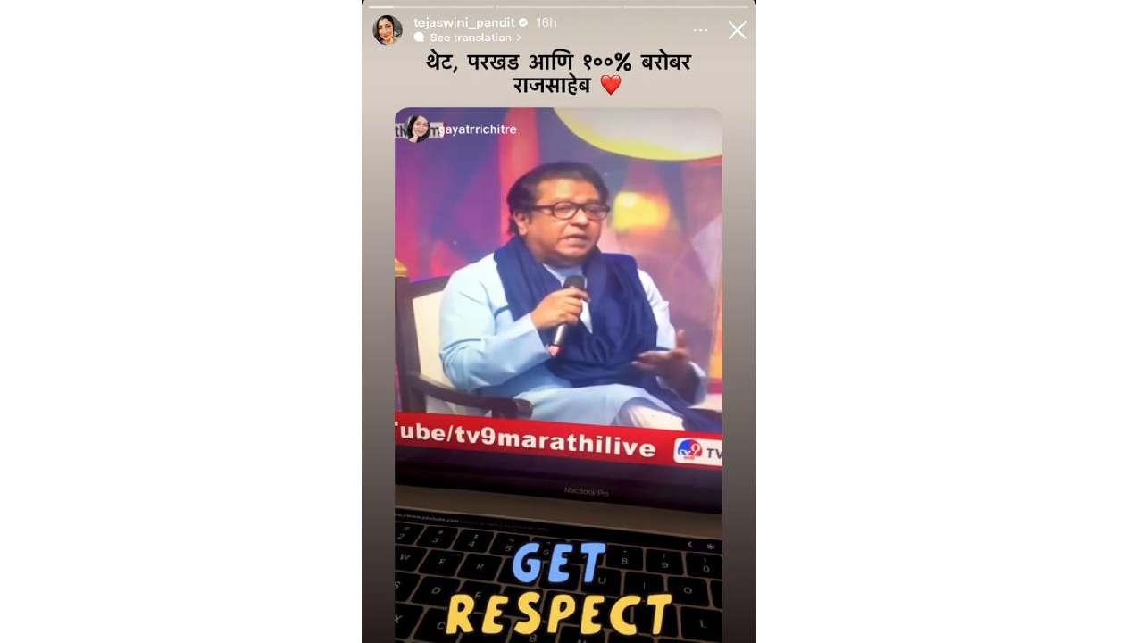 राज ठाकरेंच्या मुलाखतीचा व्हिडीओ शेअर करत तेजस्विनी पंडितने लिहिलं, ‘थेट, परखड आणि 100 टक्के बरोबर राजसाहेब!’ तेजस्विनीने राज ठाकरेंच्या वक्तव्याशी सहमती दर्शविली आहे. “कशासाठी ही आपुलकी? ही आपुलकी तुमच्या घरात ठेवा. लोकांसमोर येता तेव्हा एकमेकांना मान द्या. तरंच या सिनेसृष्टीला अर्थ आहे. साऊथमधील नवे लोक पाहा कसे नम्र बसतात. आपल्याकडे कुणीही येतं आणि खांद्यावर हात ठेऊन बसतं,” असंही राज ठाकरे म्हणाले.