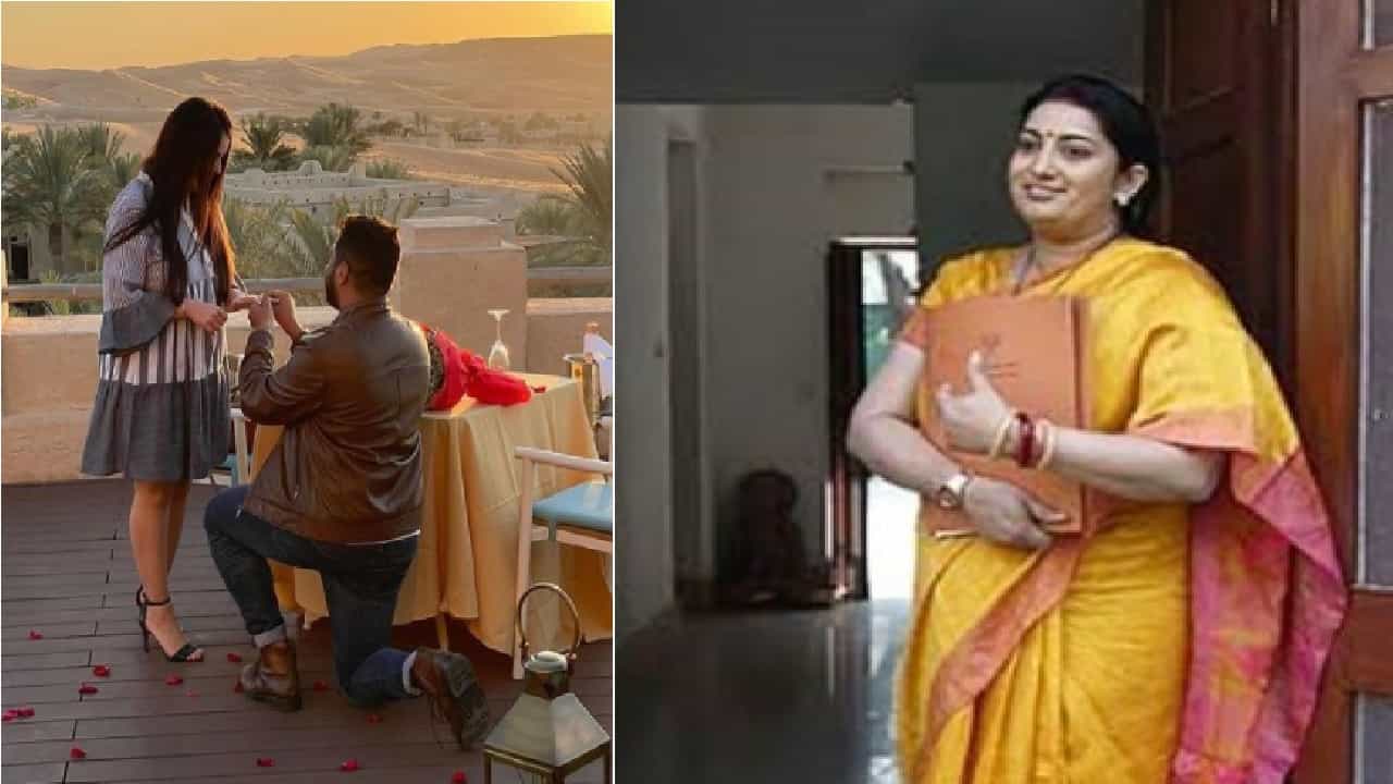 स्मृती इराणी यांनी जोईश आणि अर्जुन यांचा एक फोटो शेअर केला आहे. अर्जुन गुडघ्यांवर बसून जोईशला प्रपोज करत आहे. त्यासोबतच तिला रिंगही घालत आहे. तर दुसऱ्या एका फोटोत जोईश आणि अर्जुन रोमँटिक पोझ देताना दिसतात.