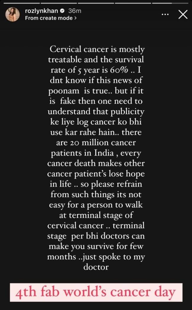 पुढे रोजलिन खान हिने लिहिले की, मला माहिती नाही की, पूनमबद्दल जी बातमी आलीये ती खरी आहे की, खोटी. जर हे खोटे असेल तर स्टंट करण्यासाठी गर्भाशयातील कॅन्सरला उपयोग केला जातोय. भारतामधील तब्बल 2 कोटी लोक हे गर्भाशयातील कॅन्सरला लढा देत आहेत. हे जर खरे असेल तर ते लोक आतमधून तुटू शकतात.