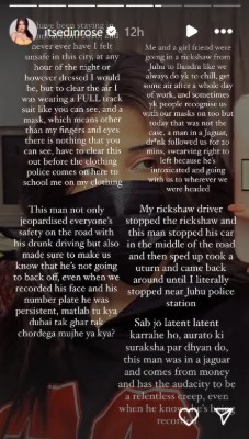 इडनने लिहीले की, ‘आम्ही त्याचा चेहरा आणि कारनंबर प्लेटचा मोबाईलने फोटो काढला. तरीही तो आमचा त्याच्या जग्वार मधून पाठलाग करतच होता. म्हणजे तू काय दुबईपर्यंत घरी सोडणार मला ? तेव्हा आमच्या रिक्षा चालकाने रस्त्याच्या मध्ये रिक्षा थांबविली, त्याने त्याची कार तेथे थांबविली. त्यानंतर त्याने वेगाने युटर्न मारून आमचा पुन्हा आता आम्ही जोपर्यंत जुहू पोलिस ठाण्यात पोहचत नाही तोपर्यंत पाठलाग केला. सर्व जण लेटेंट-लेटेंट करत आहात. महिलांच्या सुरक्षेवर जरा लक्ष द्या तो माणूस जग्वार कारमध्ये होता आणि पैसेवालाही होता.त्याचा फोटो काढूनही त्याच्यात असे वागण्याचे साहस होते….’