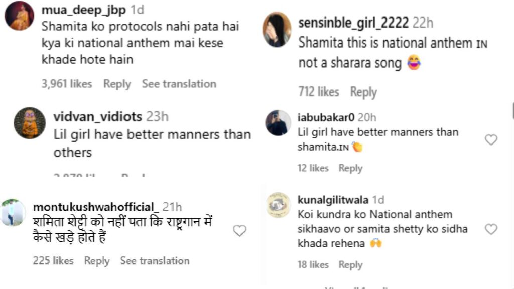 मात्र तिचा हा कॅज्युअल अविर्भाव लोकांना काही आवडला नाही. ते पाहून अनेका नेटीझन्सचा संताप झाला आणि त्यांनी तिला चांगलंच खडसावलं. राष्ट्रगीत सुरू असताना कसं उभं रहायचं असतं ? शमिताला प्रोटोकॉल माहीत नाहीत का? अशी कमेंट एकाने केली. तर त्या लहान मुलीला( शिल्पाची लेक) मोठ्यांपेक्ष जास्त मॅनर्स आहेत, असं आणखी एकाने लिहीलं. शमिता हे राष्ट्रगीत आहे, शरारा साँग नव्हे असं म्हणत आणखी एका युजरने तिला चिमटा काढला. असं (कॅज्युअल) उभं राहून शमिता ही राष्ट्रगीताचा अपमान करत्ये असं लिहीत आणखी एका यूजरने संताप व्यक्त केला. कूल बनण्याच्या नादात, राष्ट्रगीतावेळी कसं उभं रहायचं हे या लोकांना माहीत नाही, अशी कमेंट आणखी एका युजरने केली. एकंदरच सर्वांनी शमितावर चांगलेच तोंडसुख घेतलं.