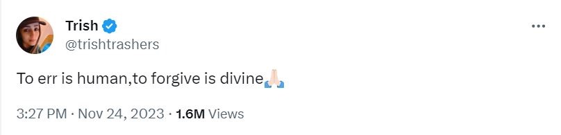 अभिनेत्याने माफी मागितल्यानंतर तृषा हिने देखील एक्सवर (ट्विटर) पोस्ट केली आहे. अभिनेत्री म्हणाली, ‘चुका करणं माणसाच्या स्वभावात आहे आणि क्षमा करणं देवांचे गुण आहेत…’ सध्या सर्वत्र तृषा हिची पोस्ट व्हायरल होत आहे. सांगायचं झालं तर, अंतरिम जामिनाच्या याचिकेला फेटाळल्यानंतर अभिनेत्याचे सूर बदलले आहेत आणि त्याने तृषा हिची माफी मागितली.
