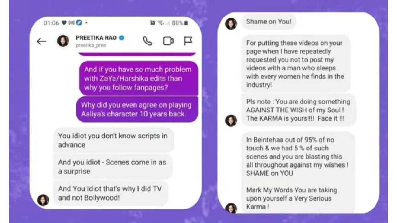 हर्षद अरोरा आणि प्रीतिका राव यांनी ‘बेइम्तिहा’ या मालिकेत एकत्र काम केलं होतं. या मालिकेतील दोघांच्या ऑनस्क्रीन केमिस्ट्रीची खूप चर्चा झाली होती. 2014 मध्ये ही मालिका टेलिव्हिजनवर प्रसारित झाली होती. प्रीतिका आणि हर्षद यांची जोडी सोशल मीडियावर हिट झाली होती. या दोघांच्या केमिस्ट्रीचे अनेक व्हिडीओ कंटेट क्रिएटर्सकडून व्हायरल केले जातात. अशाच एका व्हिडीओवर प्रीतिकाने संतप्त प्रतिक्रिया दिली होती. ‘तुला लाज वाटली पाहिजे. मी तुला सतत विनंती करूनही तू माझे व्हिडीओ सोशल मीडियावर पोस्ट करत राहिलीस. इंडस्ट्रीत भेटलेल्या प्रत्येक मुलीसोबत झोपणाऱ्या या व्यक्तीसोबतचे माझे व्हिडीओ पोस्ट करू नकोस’, असं तिने लिहिलं होतं. तिची ही कमेंट तुफान व्हायरल झाली होती. याविषयी प्रीतिकाशी संपर्क साधला असता तिने प्रतिक्रिया देणं टाळलं आहे.