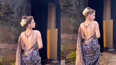 निळसर रंगाची, अतिशय सुंदर साडी , केसांची आकर्षक हेअरस्टाईल असा उर्वशीचा सुंदर लूक आहे. पण यात पटकन लक्ष वेधलं जातं ते तिच्या नो ब्लाऊज लूकमुळे आणि तिने पाठीवर घातलेल्या नेकलेसकडे. तिने साडी इतक्या स्टायलिश पद्धतीने नेसली की ती एकदम हॉट आणि क्लासी दिसत होती. व्हिडिओमध्ये, उर्वशीने निळ्या आणि सोनेरी रंगाची बनारसी सिल्क साडी परिधान केली होती ज्यामध्ये सोनेरी धाग्यांचा वापर करून फुलांचं भरतकाम करण्यात आलं होतं.उर्वशीने तिची साडी उलटा पल्लू स्टाईलमध्ये नेसली होती. व्हिडिओमध्ये ती तिची पाठ उघडी ठेवून पोज देताना दिसत आहे. तिचा लूक खूपच ग्लॅमरस दिसत होता.