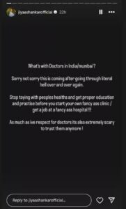 ‘वेड’ सिनेमातून चाहत्यांच्या भेटीस आलेल्या जिया हिने इन्स्टाग्राम स्टोरीवर एक पोस्ट शेअर केली आहे. पोस्ट शेअर करत अभिनेत्री डॉक्टरांवर संताप व्यक्त केला आहे. अभिनेत्री म्हणाली, ‘फक्त मुंबई नाही तर भारतातल्या डॉक्टरांना नक्की काय झालं आहे? माफ करा, पण सातत्याने नरकासमान अनुभव आल्यानंतर मला हे सगळं बोलावसं वाटत आहे. सर्वात आधीतर लोकांच्या आरोग्याशी खेळणं थांबवा आणि तुमचं फॅन्स क्लिनिक सुरु करण्यापूर्वी प्रॅक्टिस करा किंवा नावाजलेल्या रुग्णालयात नोकरी करण्यापूर्वी नीट शिक्षण घ्या आणि प्रॅक्टिस करा…’ असं अभिनेत्री संतापात म्हणाली आहे.