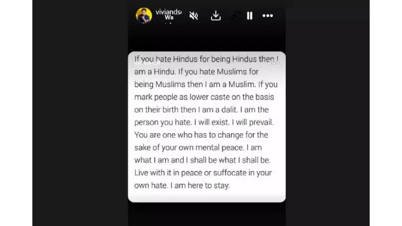 त्याने लिहिलं, ‘जर हिंदू असल्यामुळे तुम्हाला हिंदूंचा तिरस्कार वाटत असेल तर मी हिंदू आहे. जर तुम्हाला मुस्लिम असल्यामुळे त्या मुस्लिमांचा तिरस्कार वाटत असेल तर मी मुस्लिम आहे. जर तुम्ही जन्माच्या आधारावरून खालच्या जातीच्या लोकांचा द्वेष करत असाल तर मी दलित आहे. मी तो माणूस आहे, ज्याचा तुम्ही द्वेष करता आणि मी नेहमी तसाच राहीन आणि माझाच विजय होईल. स्वत:चं डोकं शांत राहावं यासाठी तुम्हाला बदलण्याची गरज आहे. मी जसा आहे तसा आहे. यापुढेही मी तसाच राहीन, जसं मला राहायचं आहे. तुम्ही शांतीने राहा किंवा आपल्याच द्वेषात घुटमळत राहा, मी तर इथेच राहणार आहे.’