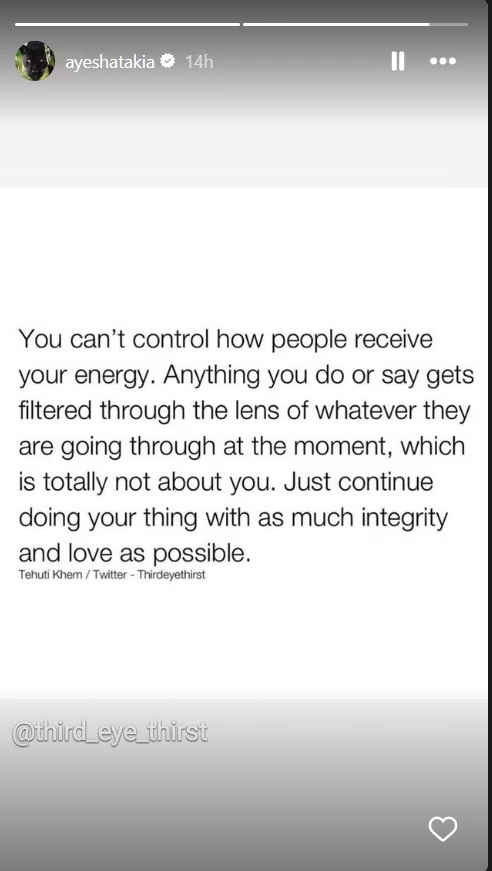 आयेशा हिने इन्स्टाग्राम स्टोरीवर एक क्रिप्टिक पोस्ट लिहिली आहे. अभिनेत्री म्हणाली, ‘लोकं तुमची उर्जा कशा प्रकारे मिळवतात, ही गोष्ट तुमच्या नियंत्रणात नसते. म्हणून शक्य तितक्या प्रामाणिकपणे आणि प्रेमाने आपले काम करत रहा…’, असं म्हणत आयेशा हिने ट्रोल करणाऱ्यांना सुनावलं आहे.