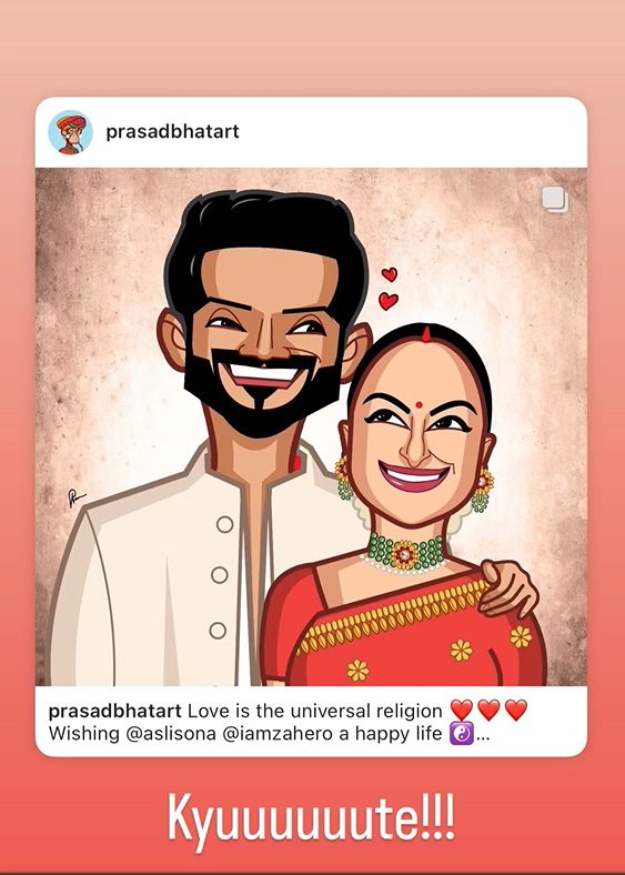 मात्र या कॅरिकेचरमध्ये हे नवविवाहीत जोडपं खूपच क्युट दिसतंय. इतकंच नाही तर प्रेम यूनिव्हर्सल रिलीजन , अशी कॅप्शनही या फोटोसोबत लिहीण्यात आली आहे. कॅरिकेचर काढणाऱ्या व्यक्तीने सोनाक्षी सिन्हा आणि झहीर इक्बाल यांना आनंदी आयुष्यासाठी शुभेच्छा दिल्या आहेत. सोनाक्षीने ती पोस्ट रि-शेअर करत ‘क्यूट’ असे लिहीले आहे. तिच्या या पोस्टमुळे लोकांना एक गोष्ट तर नक्की समजली असेल की ट्रोल्समुळे किंवा ट्रोल्सचा सोनाक्षी तिच्या वैयक्तिक आयुष्यावर परिणाम होऊ देणार नाही. ती अशा गोष्टींकडे लक्षच देत नाही.