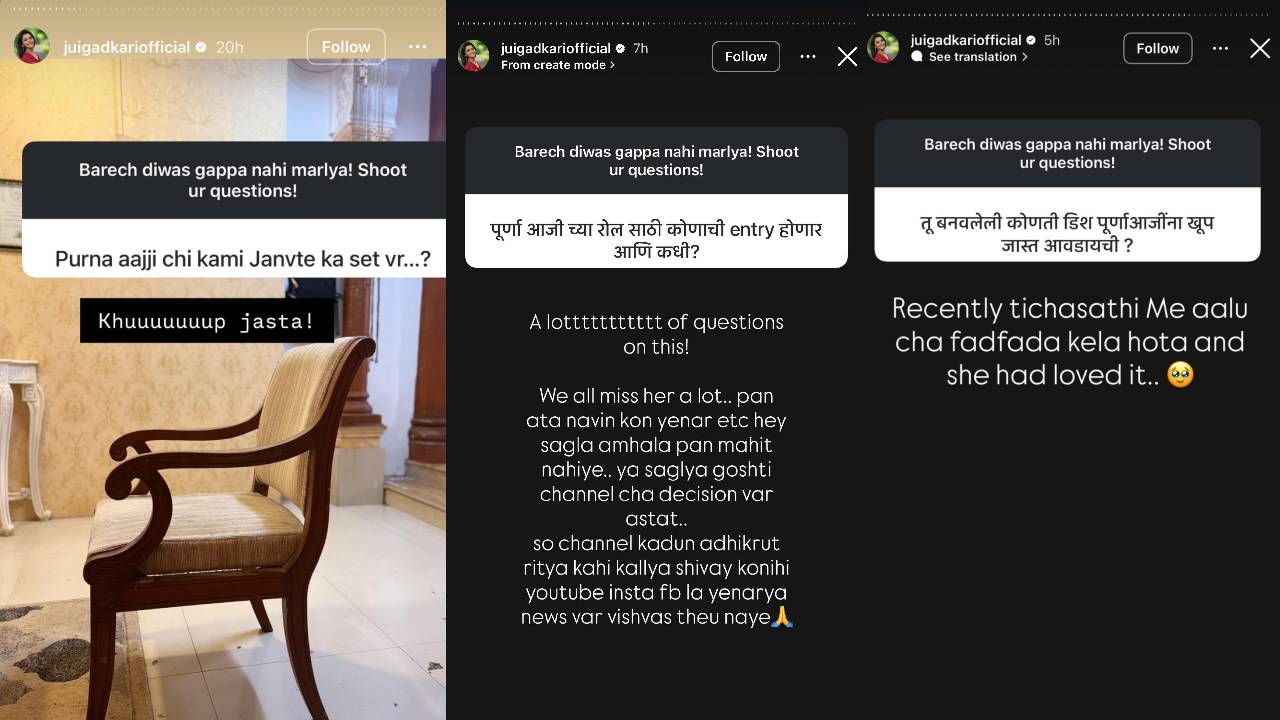 पूर्णा आजीच्या भूमिकेसाठी कोणाची एण्ट्री होणार आणि कधी, असा प्रश्न एकाने विचारला. त्यावर जुईने उत्तर दिलं, ‘याबाबत अनेकांनी प्रश्न विचारले आहेत. आम्हा सर्वांनाच तिची खूप आठवण येते. पण आता नवीन कोण येणार.. याबद्दल आम्हालाही माहीत नाही. या सगळ्या गोष्टी चॅनलच्या निर्णयावर अवलंबून असतात. त्यामुळे चॅनलकडून अधिकृतरित्या काही कळल्याशिवाय कोणीही युट्यूब, इन्स्टाग्राम, फेसबुक यांवर येणाऱ्या वृत्तांवर विश्वास ठेवू नका.’ आणखी एका युजरने जुईला विचारलं, ‘पूर्ण आजीची कमतरता सेटवर जाणवते का?’ त्यावर सेटवरील त्यांच्या खुर्चीचा फोटो पोस्ट करत जुईने लिहिलं, ‘खूप जास्त.’
