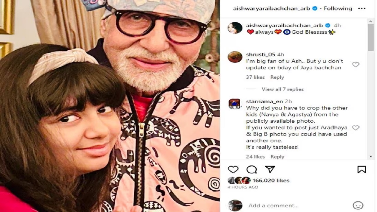 ऐश्वर्याच्या फोटोवर कमेंट करत नेटकरी म्हणाले, ‘मी तुझा खूप मोठा चाहता आहे. पण तू जया बच्चन यांच्या वाढदिवसानिमित्त कोणतीही पोस्ट करत नाही.’ दुसरा चाहता म्हणाला, ‘तुला फोटोमधून इतरांना का क्रॉप करावं लागलं..’ तिसरा नेटकरी म्हणाला, ‘आराध्या आणि अमिताभ बच्चन यांचा फोटो पोस्ट करायचा असेल तर, दुसरा करायचा. फोटो क्रॉप करून तुला काय साध्य करायचं आहे.’