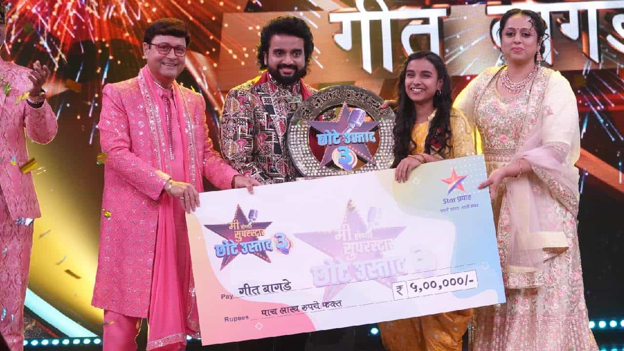 स्टार प्रवाह वाहिनीवरील ‘मी होणार सुपरस्टार छोटे उस्ताद 3’ कार्यक्रमाचा महाअंतिम सोहळा नुकताच जल्लोषात पार पडला. विरार इथली जुई चव्हाण, पलाक्षी दीक्षित, पुणे इथला देवांश भाटे, स्वरा किंबहुने, यवतमाळची गीत बागडे आणि संगमनेरच्या सारंग भालके या सहा छोट्या उस्तादांमध्ये ही महाअंतिम लढत रंगली. अटीतटीच्या या लढतीत यवतमाळच्या गीत बागडेने बाजी मारत विजेतेपदावर मोहोर उमटवली. तर उपविजेता ठरला संगमनेरचा सारंग भालके. विरारच्या पलाक्षी दीक्षितने तृतीय क्रमांक पटकावला तर उत्तेजनार्थ पारितोषिक जुई चव्हाण, देवांश भाटे आणि स्वरा किंबहुने यांना विभागून देण्यात आलं. ‘मी होणार सुपरस्टार छोटे उस्ताद 3’ची विजेती गीत बागडेला पाच लाखांची रक्कम आणि सन्मानचिन्ह देण्यात आलं.