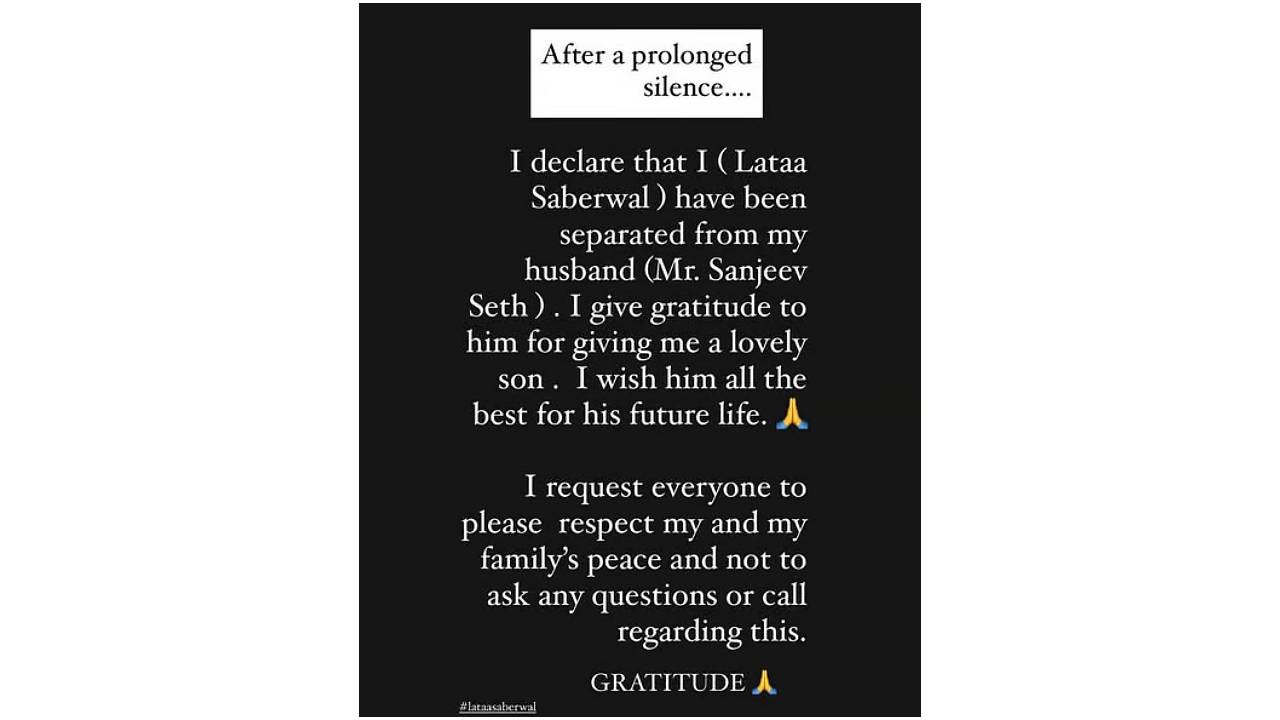 संजीवसोबत घटस्फोट जाहीर करताना लताने सोशल मीडियावरील पोस्टमध्ये लिहिलं, ‘बऱ्याच काळापासून मौन बाळगलं होतं. अखेर मी जाहीर करते की मी माझ्या पतीपासून विभक्त झाली आहे. मला एक प्रेमळ मुलगा दिल्याबद्दल मी त्यांची आभारी आहे. मी त्यांना त्यांच्या भविष्यासाठी शुभेच्छा देते. मी सर्वांना विनंती करते की कृपया माझ्या आणि माझ्या कुटुंबीयांच्या शांतीचा आदर करा. याबद्दल कोणीही प्रश्न विचारू नका किंवा फोन करू नका.’ लता आणि संजीव यांची भेट ‘ये रिश्ता क्या कहलाता है’ या मालिकेच्या सेटवर झाली होती. या मालिकेत दोघांनी अक्षराच्या आई-वडिलांची भूमिका साकारली होती. याच मालिकेत काम करताना दोघं एकमेकांच्या प्रेमात पडले आणि 2010 मध्ये लग्न केलं.