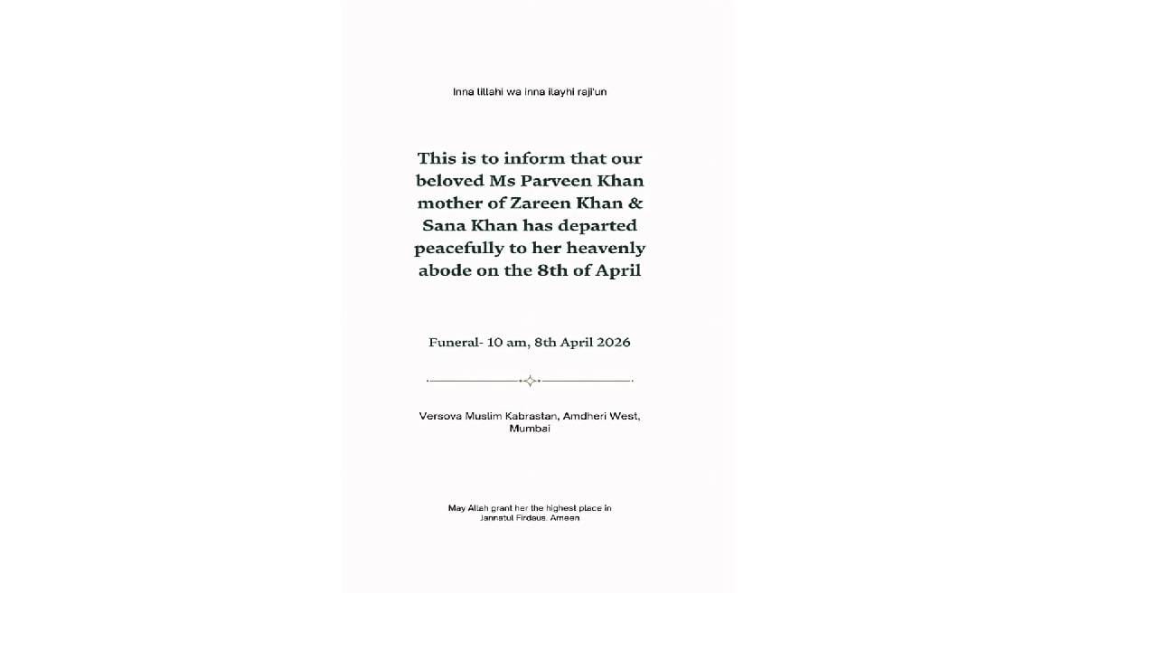 अभिनेत्री झरीन खानवर दु:खाचा डोंगर कोसळला आहे. आज (8 एप्रिल, 2026) झरीनची आई परवीन खान यांचं निधन झालं. झरीनच्या कुटुंबीयांनी याबद्दलची माहिती दिली आहे. बुधवारी सकाळी 10 वाजताच्या सुमारास परवीन खान यांच्या पार्थिवावर अंत्यसंस्कार करण्यात येतील. गेल्या काही महिन्यांपासून त्या आजारी होत्या. झरीनच्या टीमकडून जारी केलेल्या निवेदनात म्हटलंय, ‘झरीन खान आणि सना खान यांच्या आई परवीन खान यांचं 8 एप्रिल रोजी निधन झालं.’ आईच्या आजारपणाबद्दल झरीन सतत सोशल मीडियाद्वारे तिच्या चाहत्यांना माहिती देत होती. त्याचप्रमाणे आई लवकरात लवकर बरी होण्यासाठी प्रार्थना करण्याचं तिने आवाहन केलं होतं.