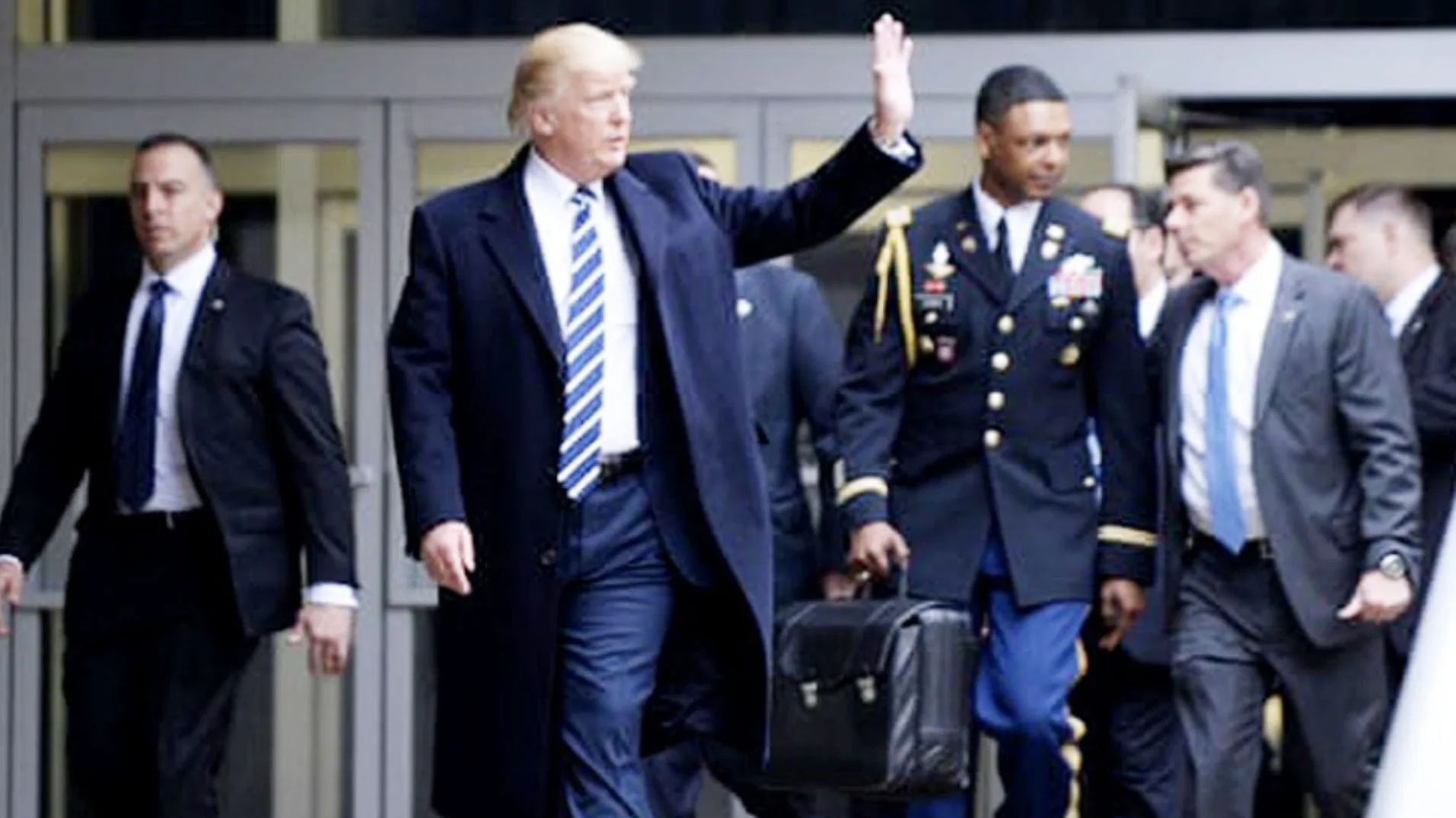 राष्ट्राध्यक्ष डोनाल्ड ट्रम्प CIA हेडक्वार्टरमधून बाहेर पडताना त्यांच्या मागे ब्लॅक ब्रिफकेस घेऊन चालणारा एक सैनिक, छायाचित्र जानेवारी 2017 चे आहे.
